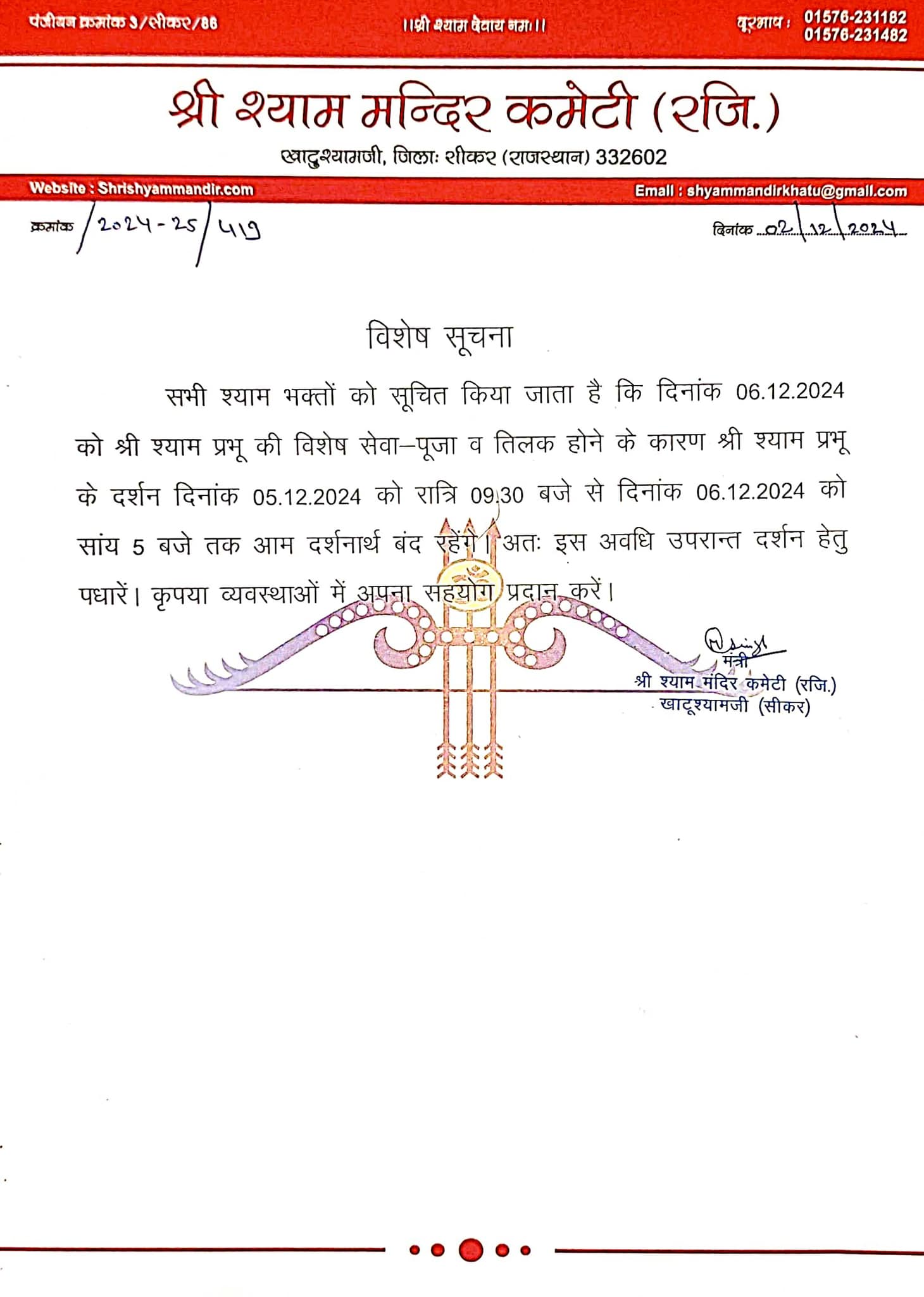 Dec22024News Share This Article Share on FacebookShare on Facebook TweetShare on Twitter Pin itShare on Pinterest Share on LinkedInShare on LinkedIn Post navigationPreviousPrevious post:भव्य दर्शन – 02 दिसम्बर 2024 – श्री श्याम दर्शनNextNext post:भव्य दर्शन – 03 दिसम्बर 2024 – श्री श्याम दर्शनRelated postsराजस्थान की पूर्व चीफ सेक्रेटरी श्रीमती उषा शर्मा जी और पूर्व ओएसडी श्री गजानंद शर्मा जीNovember 6, 2025जयपुर हवा महल क्षेत्र के विधायक स्वामी श्री बालमुकुन्द आचार्य जीOctober 30, 2025राजस्थान की उपमुख्यमंत्री श्रीमती दीया कुमारी जी आज बाबा श्याम के दर्शन करने के लिए आज खाटूश्यामजी पहुंचीOctober 26, 2025विशेष सूचनाOctober 22, 2025विशेष सूचनाOctober 15, 2025आज दिनांक – 08 अक्टूबर 2025 बिग बॉस मराठी 2 विजेता एवं बिग बॉस 16 उपविजेता श्री शिव ठाकरे जी और मानवतावादी एवं गैर सरकारी संगठन/सेना से श्रीमती गुड़िया चौधरी जी आज बाबा श्याम के दर्शन करने हेतु आज खाटूश्यामजी पहुंचेOctober 8, 2025