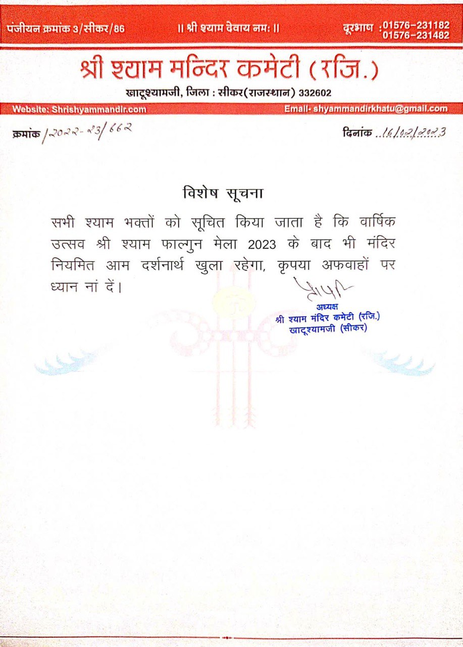 Feb172023News Share This Article Share on FacebookShare on Facebook TweetShare on Twitter Pin itShare on Pinterest Share on LinkedInShare on LinkedIn Post navigationPreviousPrevious post:प्रातः श्रृंगार दर्शन – 17 फरवरी 2023 – श्री श्याम दर्शनNextNext post:प्रातः श्रृंगार दर्शन – 18 फरवरी 2023 – श्री श्याम दर्शनRelated postsजयपुर हवा महल क्षेत्र के विधायक स्वामी श्री बालमुकुन्द आचार्य जीOctober 30, 2025राजस्थान की उपमुख्यमंत्री श्रीमती दीया कुमारी जी आज बाबा श्याम के दर्शन करने के लिए आज खाटूश्यामजी पहुंचीOctober 26, 2025विशेष सूचनाOctober 22, 2025विशेष सूचनाOctober 15, 2025आज दिनांक – 08 अक्टूबर 2025 बिग बॉस मराठी 2 विजेता एवं बिग बॉस 16 उपविजेता श्री शिव ठाकरे जी और मानवतावादी एवं गैर सरकारी संगठन/सेना से श्रीमती गुड़िया चौधरी जी आज बाबा श्याम के दर्शन करने हेतु आज खाटूश्यामजी पहुंचेOctober 8, 2025भारतीय टेलीविज़न व फ़िल्म जगत की मशहूर निर्माता और निर्देशक सुश्री एकता कपूर जीSeptember 27, 2025