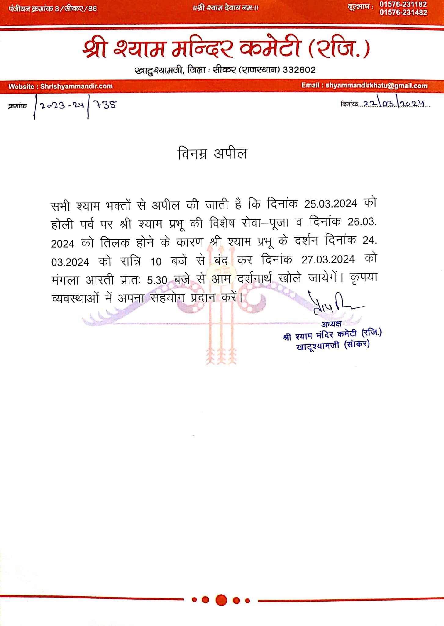 Mar222024News Share This Article Share on FacebookShare on Facebook TweetShare on Twitter Pin itShare on Pinterest Share on LinkedInShare on LinkedIn Post navigationPreviousPrevious post:भव्य दर्शन – 22 मार्च 2024 – श्री श्याम दर्शनNextNext post:भव्य दर्शन – 23 मार्च 2024 – श्री श्याम दर्शनRelated postsजयपुर हवा महल क्षेत्र के विधायक स्वामी श्री बालमुकुन्द आचार्य जीOctober 30, 2025राजस्थान की उपमुख्यमंत्री श्रीमती दीया कुमारी जी आज बाबा श्याम के दर्शन करने के लिए आज खाटूश्यामजी पहुंचीOctober 26, 2025विशेष सूचनाOctober 22, 2025विशेष सूचनाOctober 15, 2025आज दिनांक – 08 अक्टूबर 2025 बिग बॉस मराठी 2 विजेता एवं बिग बॉस 16 उपविजेता श्री शिव ठाकरे जी और मानवतावादी एवं गैर सरकारी संगठन/सेना से श्रीमती गुड़िया चौधरी जी आज बाबा श्याम के दर्शन करने हेतु आज खाटूश्यामजी पहुंचेOctober 8, 2025भारतीय टेलीविज़न व फ़िल्म जगत की मशहूर निर्माता और निर्देशक सुश्री एकता कपूर जीSeptember 27, 2025