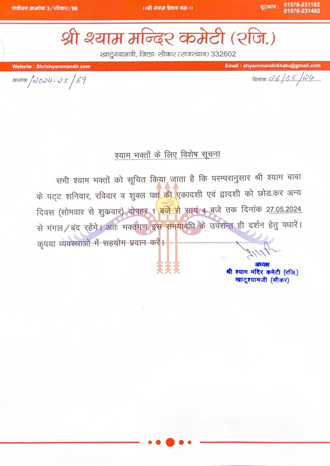 May262024News Share This Article Share on FacebookShare on Facebook TweetShare on Twitter Pin itShare on Pinterest Share on LinkedInShare on LinkedIn Post navigationPreviousPrevious post:भव्य दर्शन – 26 मई 2024 – श्री श्याम दर्शनNextNext post:भव्य दर्शन – 27 मई 2024 – श्री श्याम दर्शनRelated postsजयपुर हवा महल क्षेत्र के विधायक स्वामी श्री बालमुकुन्द आचार्य जीOctober 30, 2025राजस्थान की उपमुख्यमंत्री श्रीमती दीया कुमारी जी आज बाबा श्याम के दर्शन करने के लिए आज खाटूश्यामजी पहुंचीOctober 26, 2025विशेष सूचनाOctober 22, 2025विशेष सूचनाOctober 15, 2025आज दिनांक – 08 अक्टूबर 2025 बिग बॉस मराठी 2 विजेता एवं बिग बॉस 16 उपविजेता श्री शिव ठाकरे जी और मानवतावादी एवं गैर सरकारी संगठन/सेना से श्रीमती गुड़िया चौधरी जी आज बाबा श्याम के दर्शन करने हेतु आज खाटूश्यामजी पहुंचेOctober 8, 2025भारतीय टेलीविज़न व फ़िल्म जगत की मशहूर निर्माता और निर्देशक सुश्री एकता कपूर जीSeptember 27, 2025