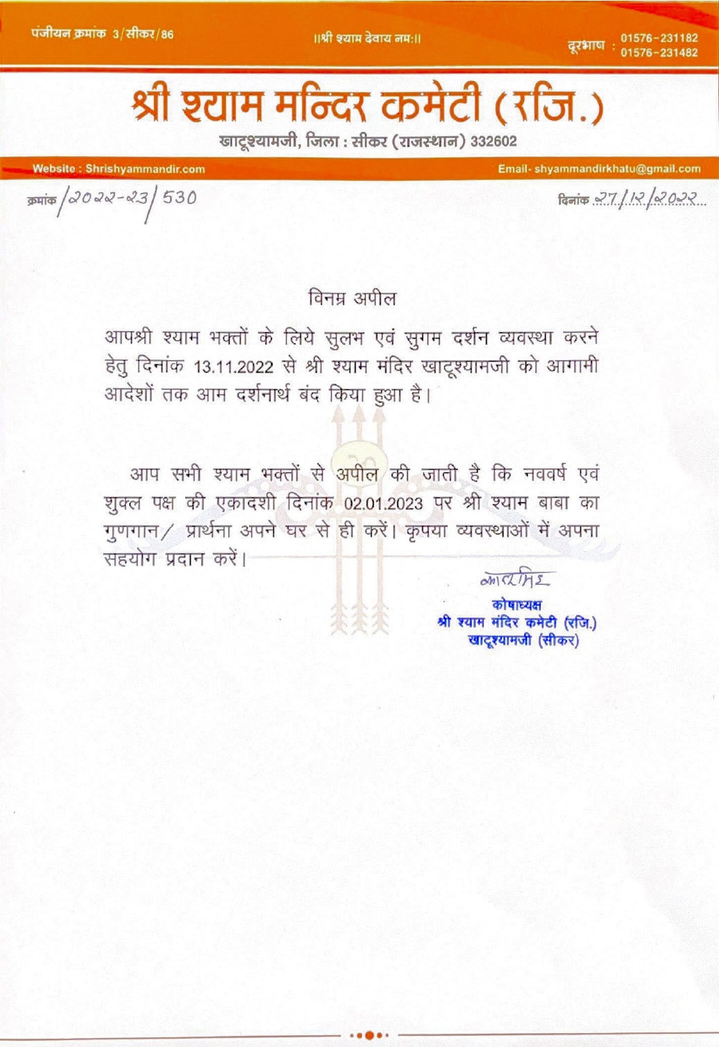Dec272022News Share This Article Share on FacebookShare on Facebook TweetShare on Twitter Pin itShare on Pinterest Share on LinkedInShare on LinkedIn Post navigationPreviousPrevious post:जरूरी सूचनाNextNext post:जरूरी सूचनाRelated postsनियन बैंक ऑफ इंडिया के मैनेजिंग डायरेक्टर (MD) और CEO श्री आशीष पांडे जी बाबा श्याम के दर्शन करने के लिए आज खाटूश्यामजी पहुंचे,December 12, 2025राजस्थान के सामाजिक न्याय एवं अधिकारिता विभाग में अतिरिक्त मुख्य सचिव श्रीमती अपर्णा अरोड़ा जी (आईएएस) बाबा श्याम के दर्शन करने के लिए आज खाटूश्यामजी पहुंची,December 12, 2025भारतीय अभिनेता श्री सुदेश बेरी जी बाबा श्याम के दर्शन करने के लिए आज खाटूश्यामजी पहुंचे,December 8, 2025झलक दिखलाजा की विजेता व कलर्स मराठी के लिए प्रथम उपविजेता और ज़ी टीवी डांस रियलिटी शो “डांस इंडिया डांस लिटिल मास्टर” की पहले रनर अप सुश्री वैष्णवी पाटिल जीDecember 7, 2025राजस्थान सरकार में कैबिनेट मन्त्री व सवाई माधोपुर से विधायक श्री किरोड़ी लाल मीणा जी बाबा श्याम के दर्शन करने के लिए आज खाटूश्यामजी पहुँचेDecember 6, 2025राजस्थान सरकार के वन एवं पर्यावरण मंत्री एवं जिले के प्रभारी मंत्री श्री संजय शर्मा जीDecember 3, 2025