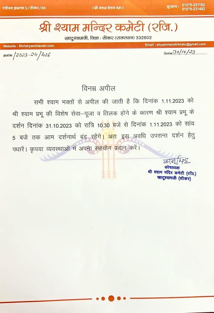Oct302023News Share This Article Share on FacebookShare on Facebook TweetShare on Twitter Pin itShare on Pinterest Share on LinkedInShare on LinkedIn Post navigationPreviousPrevious post:प्रातः शृंगार दर्शन – 30 अक्टूबर 2023 – श्री श्याम दर्शनNextNext post:प्रातः शृंगार दर्शन – 31 अक्टूबर 2023 – श्री श्याम दर्शनRelated postsदिनांक – 24 नवंबर 2025 हिमाचल प्रदेश के राज्यपाल महामहिम श्री शिव प्रताप शुक्ल जी बाबा श्याम के दर्शन करने के लिए आज खाटूश्यामजी पहुँचेNovember 24, 2025विशेष सूचनाNovember 20, 2025आज मंदिर कमेटी अध्यक्ष श्री पृथ्वी सिंह चौहान एवं मंत्री श्री मानवेंद्र सिंह चौहान द्वारा 8 करोड़ रुपये की लागत से बनने वाले नए विद्यालय भवन का स्वीकृति पत्र विद्यालय प्रधानाचार्य श्री बनवारी लाल कुमावत और उप प्रधानाचार्य श्रीमती रंजना जांगिड़ को सौंपा गया।November 18, 2025पूर्व भारतीय क्रिकेटर और कमेंटेटर श्री निखिल चोपड़ा जी आज बाबा श्याम के दर्शन करने हेतु आज खाटूश्यामजी पहुंचे,November 13, 2025राजस्थान की पूर्व चीफ सेक्रेटरी श्रीमती उषा शर्मा जी और पूर्व ओएसडी श्री गजानंद शर्मा जीNovember 6, 2025जयपुर हवा महल क्षेत्र के विधायक स्वामी श्री बालमुकुन्द आचार्य जीOctober 30, 2025