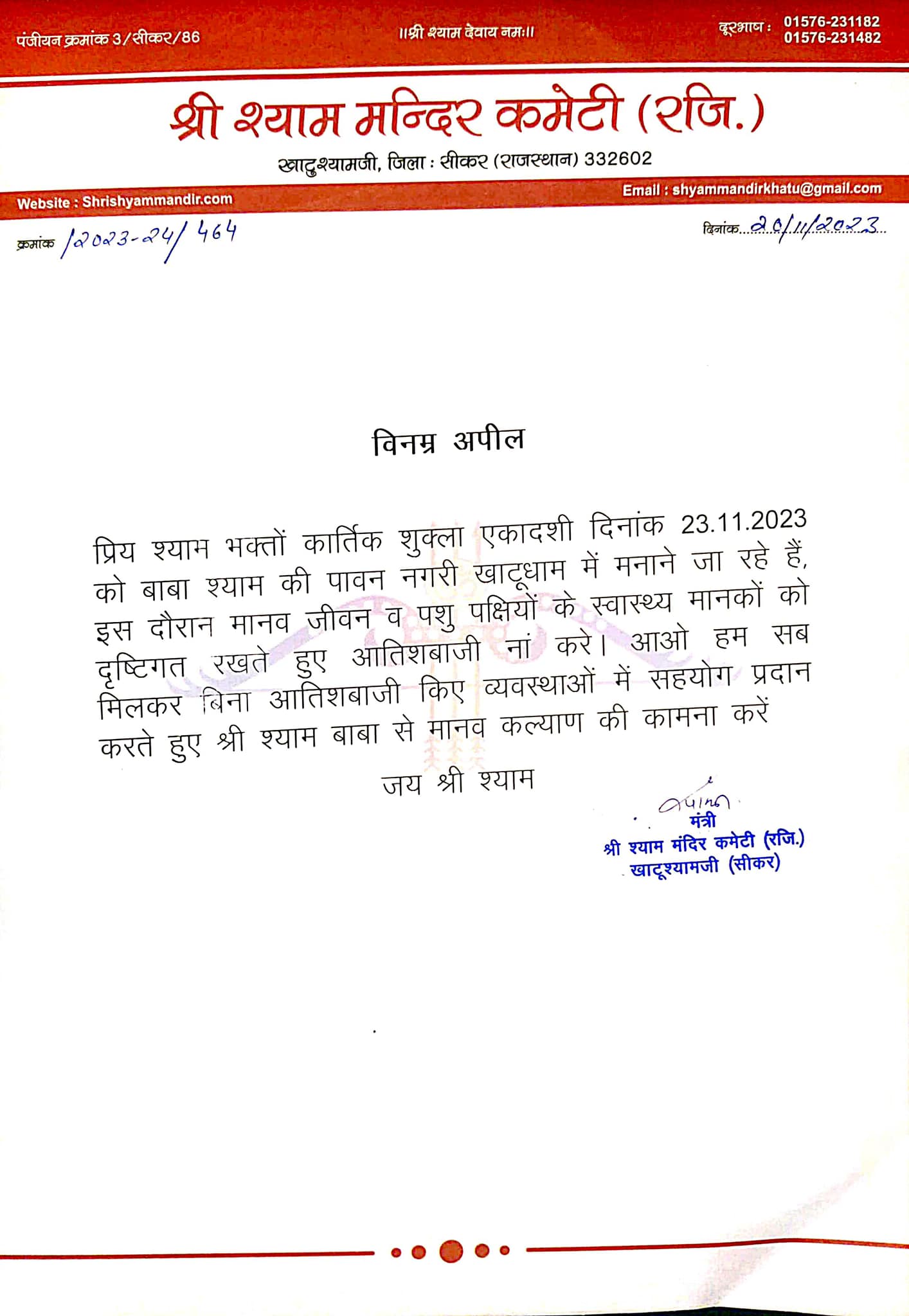 Nov202023News Share This Article Share on FacebookShare on Facebook TweetShare on Twitter Pin itShare on Pinterest Share on LinkedInShare on LinkedIn Post navigationPreviousPrevious post:प्रातः शृंगार दर्शन – 20 नवम्बर 2023 – श्री श्याम दर्शनNextNext post:जरूरी सूचनाRelated postsराजस्थान सरकार के वन एवं पर्यावरण मंत्री एवं जिले के प्रभारी मंत्री श्री संजय शर्मा जीDecember 3, 2025दिनांक – 24 नवंबर 2025 हिमाचल प्रदेश के राज्यपाल महामहिम श्री शिव प्रताप शुक्ल जी बाबा श्याम के दर्शन करने के लिए आज खाटूश्यामजी पहुँचेNovember 24, 2025विशेष सूचनाNovember 20, 2025आज मंदिर कमेटी अध्यक्ष श्री पृथ्वी सिंह चौहान एवं मंत्री श्री मानवेंद्र सिंह चौहान द्वारा 8 करोड़ रुपये की लागत से बनने वाले नए विद्यालय भवन का स्वीकृति पत्र विद्यालय प्रधानाचार्य श्री बनवारी लाल कुमावत और उप प्रधानाचार्य श्रीमती रंजना जांगिड़ को सौंपा गया।November 18, 2025पूर्व भारतीय क्रिकेटर और कमेंटेटर श्री निखिल चोपड़ा जी आज बाबा श्याम के दर्शन करने हेतु आज खाटूश्यामजी पहुंचे,November 13, 2025राजस्थान की पूर्व चीफ सेक्रेटरी श्रीमती उषा शर्मा जी और पूर्व ओएसडी श्री गजानंद शर्मा जीNovember 6, 2025
