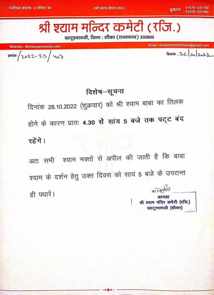 Oct262022News Share This Article Share on FacebookShare on Facebook TweetShare on Twitter Pin itShare on Pinterest Share on LinkedInShare on LinkedIn Post navigationPreviousPrevious post:प्रातः श्रृंगार दर्शन – 26 अक्टूबर 2022 – श्री श्याम दर्शनNextNext post:प्रातः श्रृंगार दर्शन – 27 अक्टूबर 2022 – श्री श्याम दर्शनRelated postsझलक दिखलाजा की विजेता व कलर्स मराठी के लिए प्रथम उपविजेता और ज़ी टीवी डांस रियलिटी शो “डांस इंडिया डांस लिटिल मास्टर” की पहले रनर अप सुश्री वैष्णवी पाटिल जीDecember 7, 2025राजस्थान सरकार में कैबिनेट मन्त्री व सवाई माधोपुर से विधायक श्री किरोड़ी लाल मीणा जी बाबा श्याम के दर्शन करने के लिए आज खाटूश्यामजी पहुँचेDecember 6, 2025राजस्थान सरकार के वन एवं पर्यावरण मंत्री एवं जिले के प्रभारी मंत्री श्री संजय शर्मा जीDecember 3, 2025दिनांक – 24 नवंबर 2025 हिमाचल प्रदेश के राज्यपाल महामहिम श्री शिव प्रताप शुक्ल जी बाबा श्याम के दर्शन करने के लिए आज खाटूश्यामजी पहुँचेNovember 24, 2025विशेष सूचनाNovember 20, 2025आज मंदिर कमेटी अध्यक्ष श्री पृथ्वी सिंह चौहान एवं मंत्री श्री मानवेंद्र सिंह चौहान द्वारा 8 करोड़ रुपये की लागत से बनने वाले नए विद्यालय भवन का स्वीकृति पत्र विद्यालय प्रधानाचार्य श्री बनवारी लाल कुमावत और उप प्रधानाचार्य श्रीमती रंजना जांगिड़ को सौंपा गया।November 18, 2025