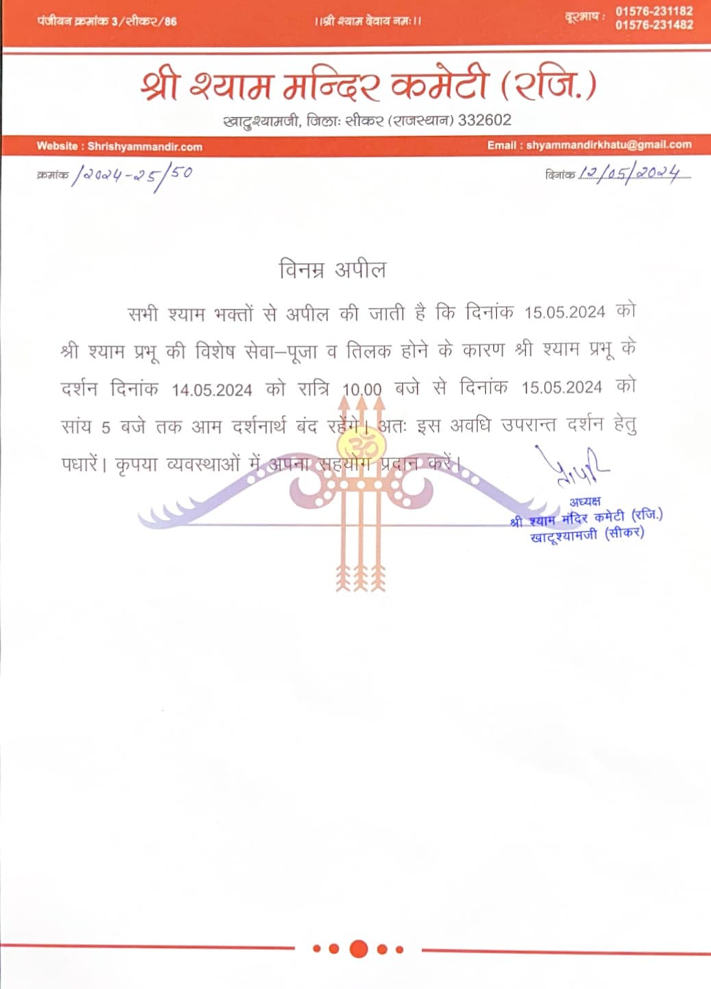 May122024News Share This Article Share on FacebookShare on Facebook TweetShare on Twitter Pin itShare on Pinterest Share on LinkedInShare on LinkedIn Post navigationPreviousPrevious post:भव्य दर्शन – 12 मई 2024 – श्री श्याम दर्शनNextNext post:भव्य दर्शन – 13 मई 2024 – श्री श्याम दर्शनRelated postsझलक दिखलाजा की विजेता व कलर्स मराठी के लिए प्रथम उपविजेता और ज़ी टीवी डांस रियलिटी शो “डांस इंडिया डांस लिटिल मास्टर” की पहले रनर अप सुश्री वैष्णवी पाटिल जीDecember 7, 2025राजस्थान सरकार में कैबिनेट मन्त्री व सवाई माधोपुर से विधायक श्री किरोड़ी लाल मीणा जी बाबा श्याम के दर्शन करने के लिए आज खाटूश्यामजी पहुँचेDecember 6, 2025राजस्थान सरकार के वन एवं पर्यावरण मंत्री एवं जिले के प्रभारी मंत्री श्री संजय शर्मा जीDecember 3, 2025दिनांक – 24 नवंबर 2025 हिमाचल प्रदेश के राज्यपाल महामहिम श्री शिव प्रताप शुक्ल जी बाबा श्याम के दर्शन करने के लिए आज खाटूश्यामजी पहुँचेNovember 24, 2025विशेष सूचनाNovember 20, 2025आज मंदिर कमेटी अध्यक्ष श्री पृथ्वी सिंह चौहान एवं मंत्री श्री मानवेंद्र सिंह चौहान द्वारा 8 करोड़ रुपये की लागत से बनने वाले नए विद्यालय भवन का स्वीकृति पत्र विद्यालय प्रधानाचार्य श्री बनवारी लाल कुमावत और उप प्रधानाचार्य श्रीमती रंजना जांगिड़ को सौंपा गया।November 18, 2025