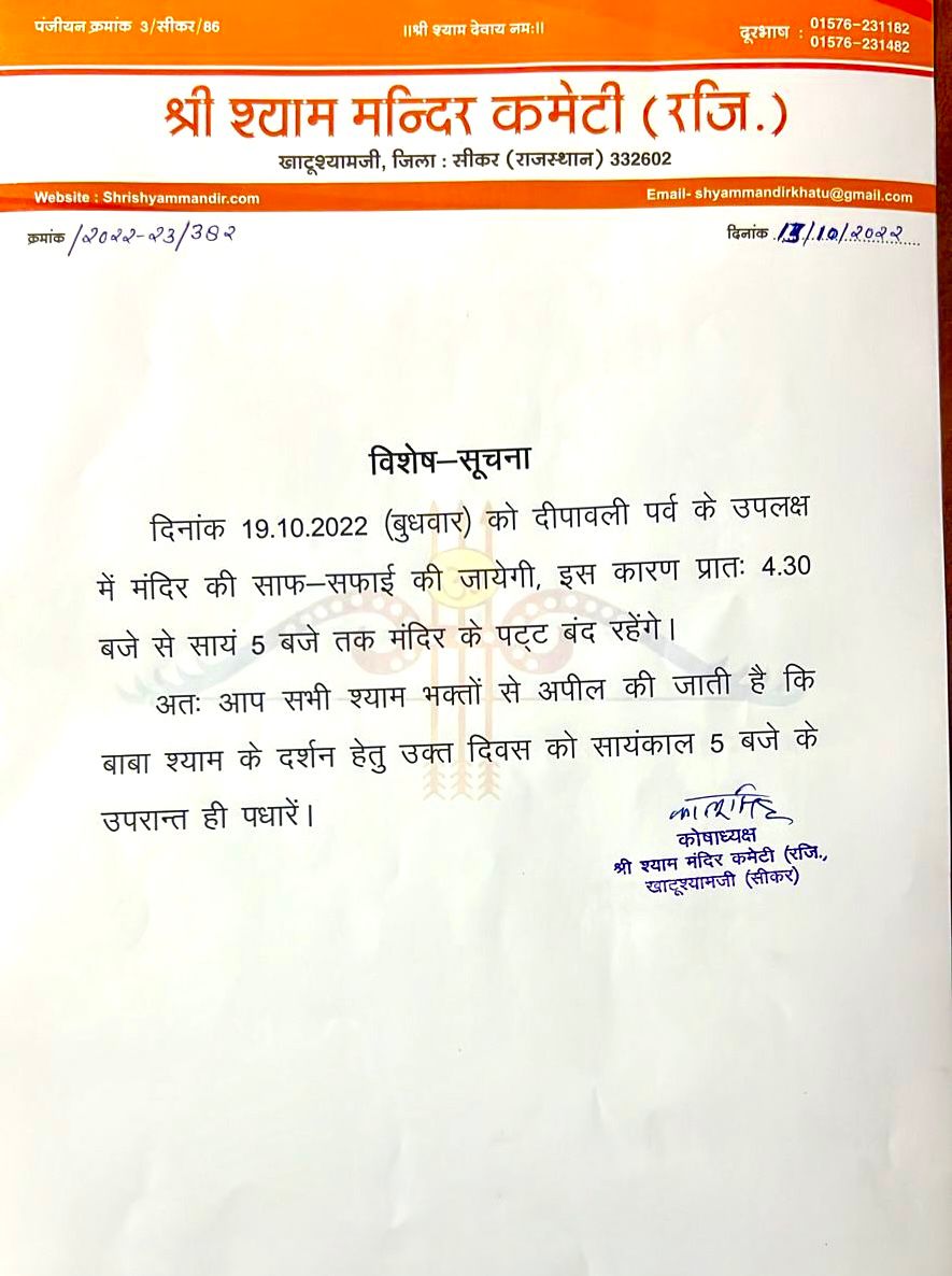 Oct132022News Share This Article Share on FacebookShare on Facebook TweetShare on Twitter Pin itShare on Pinterest Share on LinkedInShare on LinkedIn Post navigationPreviousPrevious post:प्रातः श्रृंगार दर्शन – 13 अक्टूबर 2022 – श्री श्याम दर्शनNextNext post:प्रातः श्रृंगार दर्शन – 14 अक्टूबर 2022 – श्री श्याम दर्शनRelated postsझलक दिखलाजा की विजेता व कलर्स मराठी के लिए प्रथम उपविजेता और ज़ी टीवी डांस रियलिटी शो “डांस इंडिया डांस लिटिल मास्टर” की पहले रनर अप सुश्री वैष्णवी पाटिल जीDecember 7, 2025राजस्थान सरकार में कैबिनेट मन्त्री व सवाई माधोपुर से विधायक श्री किरोड़ी लाल मीणा जी बाबा श्याम के दर्शन करने के लिए आज खाटूश्यामजी पहुँचेDecember 6, 2025राजस्थान सरकार के वन एवं पर्यावरण मंत्री एवं जिले के प्रभारी मंत्री श्री संजय शर्मा जीDecember 3, 2025दिनांक – 24 नवंबर 2025 हिमाचल प्रदेश के राज्यपाल महामहिम श्री शिव प्रताप शुक्ल जी बाबा श्याम के दर्शन करने के लिए आज खाटूश्यामजी पहुँचेNovember 24, 2025विशेष सूचनाNovember 20, 2025आज मंदिर कमेटी अध्यक्ष श्री पृथ्वी सिंह चौहान एवं मंत्री श्री मानवेंद्र सिंह चौहान द्वारा 8 करोड़ रुपये की लागत से बनने वाले नए विद्यालय भवन का स्वीकृति पत्र विद्यालय प्रधानाचार्य श्री बनवारी लाल कुमावत और उप प्रधानाचार्य श्रीमती रंजना जांगिड़ को सौंपा गया।November 18, 2025