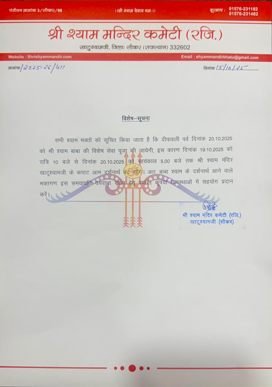 Oct152025News Share This Article Share on FacebookShare on Facebook TweetShare on Twitter Pin itShare on Pinterest Share on LinkedInShare on LinkedIn Post navigationPreviousPrevious post:भव्य दर्शन – 15 अक्टूबर 2025 – श्री श्याम दर्शनNextNext post:भव्य दर्शन – 16 अक्टूबर 2025 – श्री श्याम दर्शनRelated postsदिनांक – 24 नवंबर 2025 हिमाचल प्रदेश के राज्यपाल महामहिम श्री शिव प्रताप शुक्ल जी बाबा श्याम के दर्शन करने के लिए आज खाटूश्यामजी पहुँचेNovember 24, 2025विशेष सूचनाNovember 20, 2025आज मंदिर कमेटी अध्यक्ष श्री पृथ्वी सिंह चौहान एवं मंत्री श्री मानवेंद्र सिंह चौहान द्वारा 8 करोड़ रुपये की लागत से बनने वाले नए विद्यालय भवन का स्वीकृति पत्र विद्यालय प्रधानाचार्य श्री बनवारी लाल कुमावत और उप प्रधानाचार्य श्रीमती रंजना जांगिड़ को सौंपा गया।November 18, 2025पूर्व भारतीय क्रिकेटर और कमेंटेटर श्री निखिल चोपड़ा जी आज बाबा श्याम के दर्शन करने हेतु आज खाटूश्यामजी पहुंचे,November 13, 2025राजस्थान की पूर्व चीफ सेक्रेटरी श्रीमती उषा शर्मा जी और पूर्व ओएसडी श्री गजानंद शर्मा जीNovember 6, 2025जयपुर हवा महल क्षेत्र के विधायक स्वामी श्री बालमुकुन्द आचार्य जीOctober 30, 2025