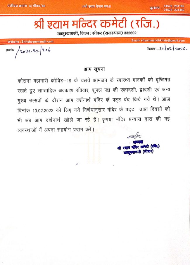 आज दिनांक – 09 फरवरी 2022 लोकसभा अध्यक्ष श्री ओम बिरला जी की धर्मपत्नी श्रीमति अमिता बिरला व अध्यक्ष जी के बड़े भाई श्री राजेश बिरला जी आज बाबा श्याम का आशीर्वाद लेने खाटूश्यामजी पहुंचे , जहां श्री श्याम मंदिर कमेटी के सदस्य श्री प्रताप सिंह चौहान ने बाबा श्याम का दुप्पट्टा पहनाकर व प्रतीक…