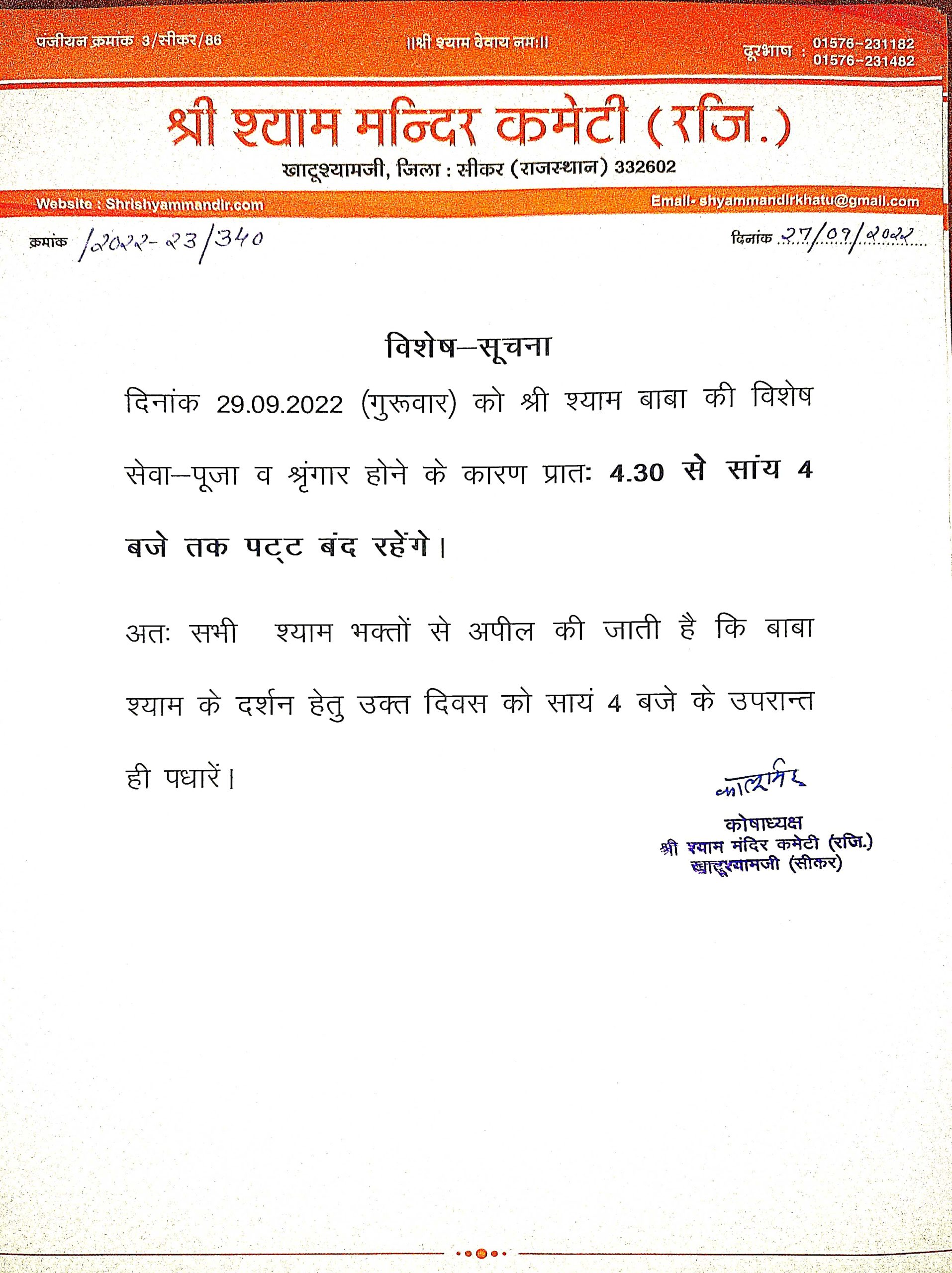 Sep272022News Share This Article Share on FacebookShare on Facebook TweetShare on Twitter Pin itShare on Pinterest Share on LinkedInShare on LinkedIn Post navigationPreviousPrevious post:प्रातः श्रृंगार दर्शन – 27 सितम्बर 2022 – श्री श्याम दर्शनNextNext post:प्रातः श्रृंगार दर्शन – 28 सितम्बर 2022 – श्री श्याम दर्शनRelated postsराजस्थान सरकार के वन एवं पर्यावरण मंत्री एवं जिले के प्रभारी मंत्री श्री संजय शर्मा जीDecember 3, 2025दिनांक – 24 नवंबर 2025 हिमाचल प्रदेश के राज्यपाल महामहिम श्री शिव प्रताप शुक्ल जी बाबा श्याम के दर्शन करने के लिए आज खाटूश्यामजी पहुँचेNovember 24, 2025विशेष सूचनाNovember 20, 2025आज मंदिर कमेटी अध्यक्ष श्री पृथ्वी सिंह चौहान एवं मंत्री श्री मानवेंद्र सिंह चौहान द्वारा 8 करोड़ रुपये की लागत से बनने वाले नए विद्यालय भवन का स्वीकृति पत्र विद्यालय प्रधानाचार्य श्री बनवारी लाल कुमावत और उप प्रधानाचार्य श्रीमती रंजना जांगिड़ को सौंपा गया।November 18, 2025पूर्व भारतीय क्रिकेटर और कमेंटेटर श्री निखिल चोपड़ा जी आज बाबा श्याम के दर्शन करने हेतु आज खाटूश्यामजी पहुंचे,November 13, 2025राजस्थान की पूर्व चीफ सेक्रेटरी श्रीमती उषा शर्मा जी और पूर्व ओएसडी श्री गजानंद शर्मा जीNovember 6, 2025