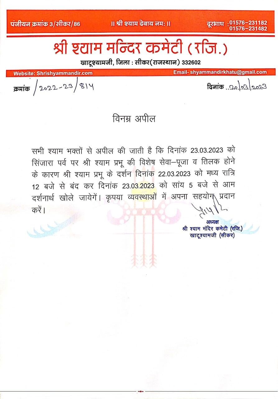 Mar202023News Share This Article Share on FacebookShare on Facebook TweetShare on Twitter Pin itShare on Pinterest Share on LinkedInShare on LinkedIn Post navigationPreviousPrevious post:प्रातः श्रृंगार दर्शन – 20 मार्च 2023 – श्री श्याम दर्शनNextNext post:प्रातः श्रृंगार दर्शन – 22 मार्च 2023 – श्री श्याम दर्शनRelated postsदिनांक – 24 नवंबर 2025 हिमाचल प्रदेश के राज्यपाल महामहिम श्री शिव प्रताप शुक्ल जी बाबा श्याम के दर्शन करने के लिए आज खाटूश्यामजी पहुँचेNovember 24, 2025विशेष सूचनाNovember 20, 2025आज मंदिर कमेटी अध्यक्ष श्री पृथ्वी सिंह चौहान एवं मंत्री श्री मानवेंद्र सिंह चौहान द्वारा 8 करोड़ रुपये की लागत से बनने वाले नए विद्यालय भवन का स्वीकृति पत्र विद्यालय प्रधानाचार्य श्री बनवारी लाल कुमावत और उप प्रधानाचार्य श्रीमती रंजना जांगिड़ को सौंपा गया।November 18, 2025पूर्व भारतीय क्रिकेटर और कमेंटेटर श्री निखिल चोपड़ा जी आज बाबा श्याम के दर्शन करने हेतु आज खाटूश्यामजी पहुंचे,November 13, 2025राजस्थान की पूर्व चीफ सेक्रेटरी श्रीमती उषा शर्मा जी और पूर्व ओएसडी श्री गजानंद शर्मा जीNovember 6, 2025जयपुर हवा महल क्षेत्र के विधायक स्वामी श्री बालमुकुन्द आचार्य जीOctober 30, 2025