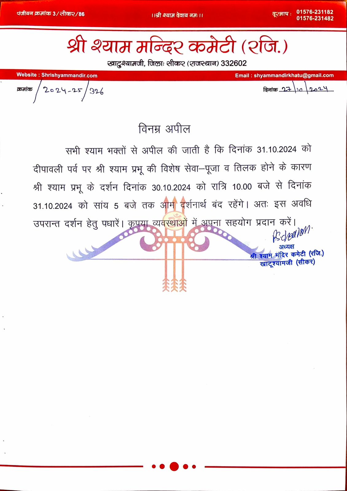 Oct272024News Share This Article Share on FacebookShare on Facebook TweetShare on Twitter Pin itShare on Pinterest Share on LinkedInShare on LinkedIn Post navigationPreviousPrevious post:भव्य दर्शन – 27 अक्टूबर 2024 – श्री श्याम दर्शनNextNext post:भव्य दर्शन – 28 अक्टूबर 2024 – श्री श्याम दर्शनRelated postsझलक दिखलाजा की विजेता व कलर्स मराठी के लिए प्रथम उपविजेता और ज़ी टीवी डांस रियलिटी शो “डांस इंडिया डांस लिटिल मास्टर” की पहले रनर अप सुश्री वैष्णवी पाटिल जीDecember 7, 2025राजस्थान सरकार में कैबिनेट मन्त्री व सवाई माधोपुर से विधायक श्री किरोड़ी लाल मीणा जी बाबा श्याम के दर्शन करने के लिए आज खाटूश्यामजी पहुँचेDecember 6, 2025राजस्थान सरकार के वन एवं पर्यावरण मंत्री एवं जिले के प्रभारी मंत्री श्री संजय शर्मा जीDecember 3, 2025दिनांक – 24 नवंबर 2025 हिमाचल प्रदेश के राज्यपाल महामहिम श्री शिव प्रताप शुक्ल जी बाबा श्याम के दर्शन करने के लिए आज खाटूश्यामजी पहुँचेNovember 24, 2025विशेष सूचनाNovember 20, 2025आज मंदिर कमेटी अध्यक्ष श्री पृथ्वी सिंह चौहान एवं मंत्री श्री मानवेंद्र सिंह चौहान द्वारा 8 करोड़ रुपये की लागत से बनने वाले नए विद्यालय भवन का स्वीकृति पत्र विद्यालय प्रधानाचार्य श्री बनवारी लाल कुमावत और उप प्रधानाचार्य श्रीमती रंजना जांगिड़ को सौंपा गया।November 18, 2025