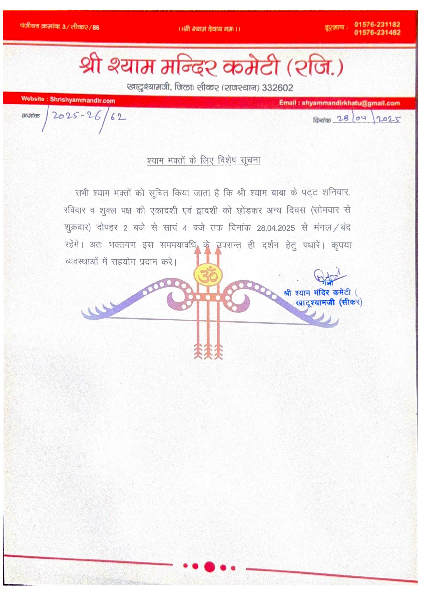 Apr292025News Share This Article Share on FacebookShare on Facebook TweetShare on Twitter Pin itShare on Pinterest Share on LinkedInShare on LinkedIn Post navigationPreviousPrevious post:कर्नाटक के राज्यपाल महामहिम श्री थावरचंद गेहलोत जी बाबा श्याम के दर्शन करने के लिए आज खाटूश्यामजी पहुँचे,NextNext post:भव्य दर्शन – 30 अप्रैल 2025 – श्री श्याम दर्शनRelated postsदिनांक – 24 नवंबर 2025 हिमाचल प्रदेश के राज्यपाल महामहिम श्री शिव प्रताप शुक्ल जी बाबा श्याम के दर्शन करने के लिए आज खाटूश्यामजी पहुँचेNovember 24, 2025विशेष सूचनाNovember 20, 2025आज मंदिर कमेटी अध्यक्ष श्री पृथ्वी सिंह चौहान एवं मंत्री श्री मानवेंद्र सिंह चौहान द्वारा 8 करोड़ रुपये की लागत से बनने वाले नए विद्यालय भवन का स्वीकृति पत्र विद्यालय प्रधानाचार्य श्री बनवारी लाल कुमावत और उप प्रधानाचार्य श्रीमती रंजना जांगिड़ को सौंपा गया।November 18, 2025पूर्व भारतीय क्रिकेटर और कमेंटेटर श्री निखिल चोपड़ा जी आज बाबा श्याम के दर्शन करने हेतु आज खाटूश्यामजी पहुंचे,November 13, 2025राजस्थान की पूर्व चीफ सेक्रेटरी श्रीमती उषा शर्मा जी और पूर्व ओएसडी श्री गजानंद शर्मा जीNovember 6, 2025जयपुर हवा महल क्षेत्र के विधायक स्वामी श्री बालमुकुन्द आचार्य जीOctober 30, 2025