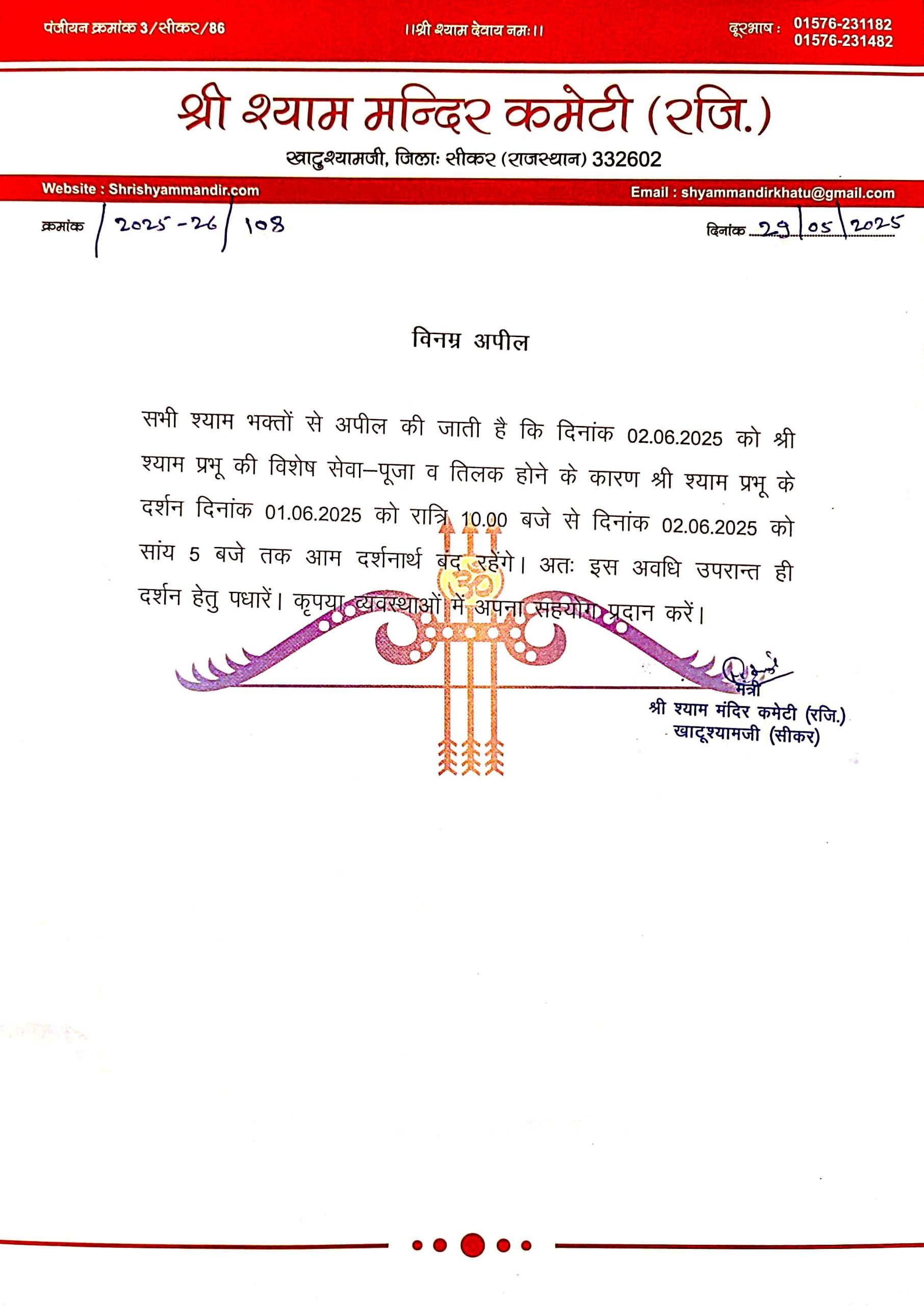May292025News Share This Article Share on FacebookShare on Facebook TweetShare on Twitter Pin itShare on Pinterest Share on LinkedInShare on LinkedIn Post navigationPreviousPrevious post:भव्य दर्शन – 29 मई 2025 – श्री श्याम दर्शनNextNext post:भव्य दर्शन – 30 मई 2025 – श्री श्याम दर्शनRelated postsराजस्थान की पूर्व चीफ सेक्रेटरी श्रीमती उषा शर्मा जी और पूर्व ओएसडी श्री गजानंद शर्मा जीNovember 6, 2025जयपुर हवा महल क्षेत्र के विधायक स्वामी श्री बालमुकुन्द आचार्य जीOctober 30, 2025राजस्थान की उपमुख्यमंत्री श्रीमती दीया कुमारी जी आज बाबा श्याम के दर्शन करने के लिए आज खाटूश्यामजी पहुंचीOctober 26, 2025विशेष सूचनाOctober 22, 2025विशेष सूचनाOctober 15, 2025आज दिनांक – 08 अक्टूबर 2025 बिग बॉस मराठी 2 विजेता एवं बिग बॉस 16 उपविजेता श्री शिव ठाकरे जी और मानवतावादी एवं गैर सरकारी संगठन/सेना से श्रीमती गुड़िया चौधरी जी आज बाबा श्याम के दर्शन करने हेतु आज खाटूश्यामजी पहुंचेOctober 8, 2025