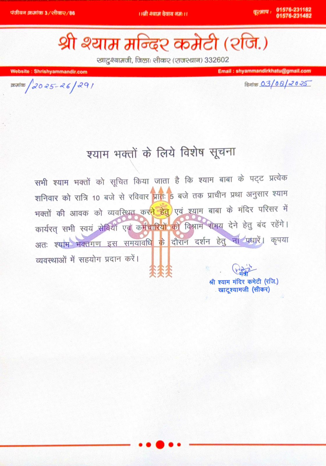Aug32025News Share This Article Share on FacebookShare on Facebook TweetShare on Twitter Pin itShare on Pinterest Share on LinkedInShare on LinkedIn Post navigationPreviousPrevious post:भव्य दर्शन – 03 अगस्त 2025 – श्री श्याम दर्शनNextNext post:भव्य दर्शन – 03 अगस्त 2025 – श्री श्याम दर्शनRelated postsजयपुर हवा महल क्षेत्र के विधायक स्वामी श्री बालमुकुन्द आचार्य जीOctober 30, 2025राजस्थान की उपमुख्यमंत्री श्रीमती दीया कुमारी जी आज बाबा श्याम के दर्शन करने के लिए आज खाटूश्यामजी पहुंचीOctober 26, 2025विशेष सूचनाOctober 22, 2025विशेष सूचनाOctober 15, 2025आज दिनांक – 08 अक्टूबर 2025 बिग बॉस मराठी 2 विजेता एवं बिग बॉस 16 उपविजेता श्री शिव ठाकरे जी और मानवतावादी एवं गैर सरकारी संगठन/सेना से श्रीमती गुड़िया चौधरी जी आज बाबा श्याम के दर्शन करने हेतु आज खाटूश्यामजी पहुंचेOctober 8, 2025भारतीय टेलीविज़न व फ़िल्म जगत की मशहूर निर्माता और निर्देशक सुश्री एकता कपूर जीSeptember 27, 2025
