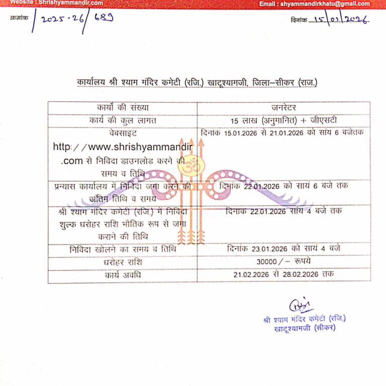 10 करोड़ रुपये की लागत से बनने वाले 125 टीपीडी क्षमता का ठोस अपशिष्ट प्रसंस्करण संयंत्र एवं मैटेरियल रिकवरी फैसिलिटी (MRF) तथा 300 केएलडी क्षमताNewsBy khatuJanuary 13, 2026Leave a commentहारे का सहारा बाबा श्याम हमारा आज दिनांक – 13 जनवरी 2026 श्री श्याम मंदिर कमेटी की एक और बड़ी पहल आज मंदिर कमेटी अध्यक्ष Read more