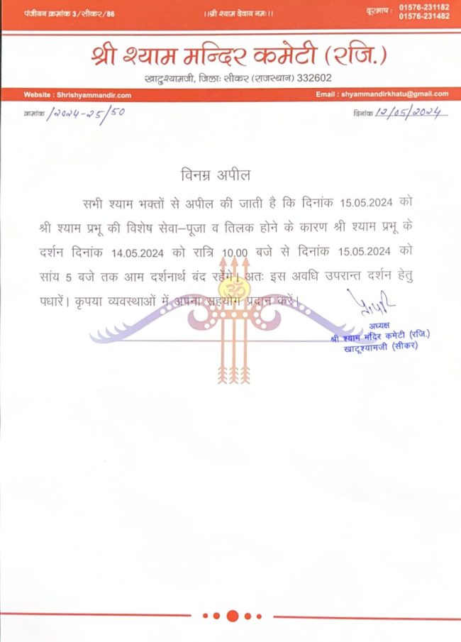 भव्य दर्शन – 16 मई 2024 – श्री श्याम दर्शन