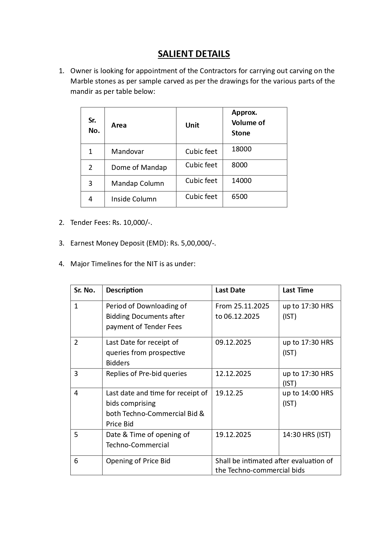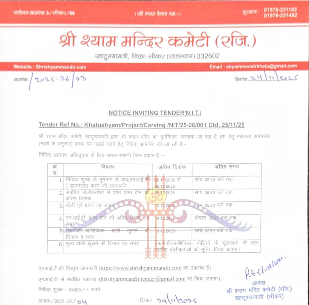 Nov252025e-nivida निविदा सूचना Marble Stones Carving Share This Article Share on FacebookShare on Facebook TweetShare on Twitter Pin itShare on Pinterest Share on LinkedInShare on LinkedIn Post navigationPreviousPrevious post:भव्य दर्शन – 25 नवम्बर 2025 – श्री श्याम दर्शन